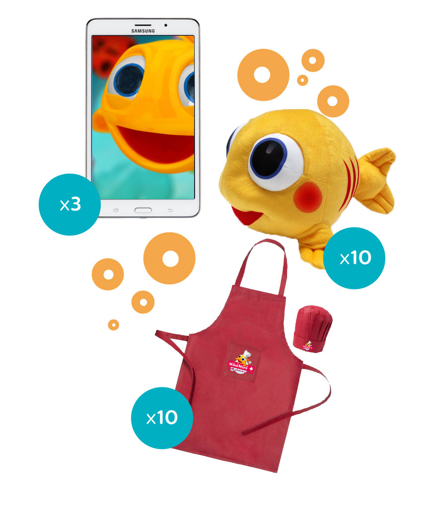 Do wygrania łącznie 23 fantastyczne nagrody! 3x nagroda główna: - tablet Samsung 10 x wyróżnienia - maskotka Rybki MiniMini 10 x nagroda dodatkowa - Fartuszki kuchenne MiniMini+